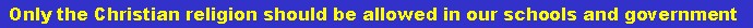 It’s time for all Americans, especially our government and leaders, to stress that America is still a Christian and to start living the life God expects of His people. Our public and government places should not only acknowledge but also promote Christianity and do all necessary to further God’s kingdom, as did our forefathers. Certainly there is freedom of religion in America and those who want to practice pagan religions have a right to do so, but they should practice it in the privacy of their homes and not try to impose it on the rest of us Americans. All schools, public and private, should promote only Christianity since we claim to be a Christian nation, and teach our children to be godly and moral citizens.